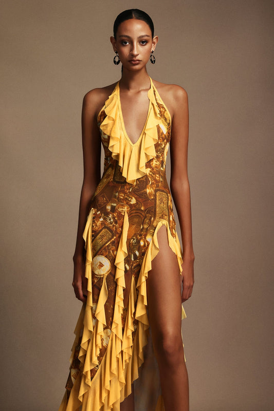 Uri Halter Yaka Kolsuz Volanlı Maxi Elbise