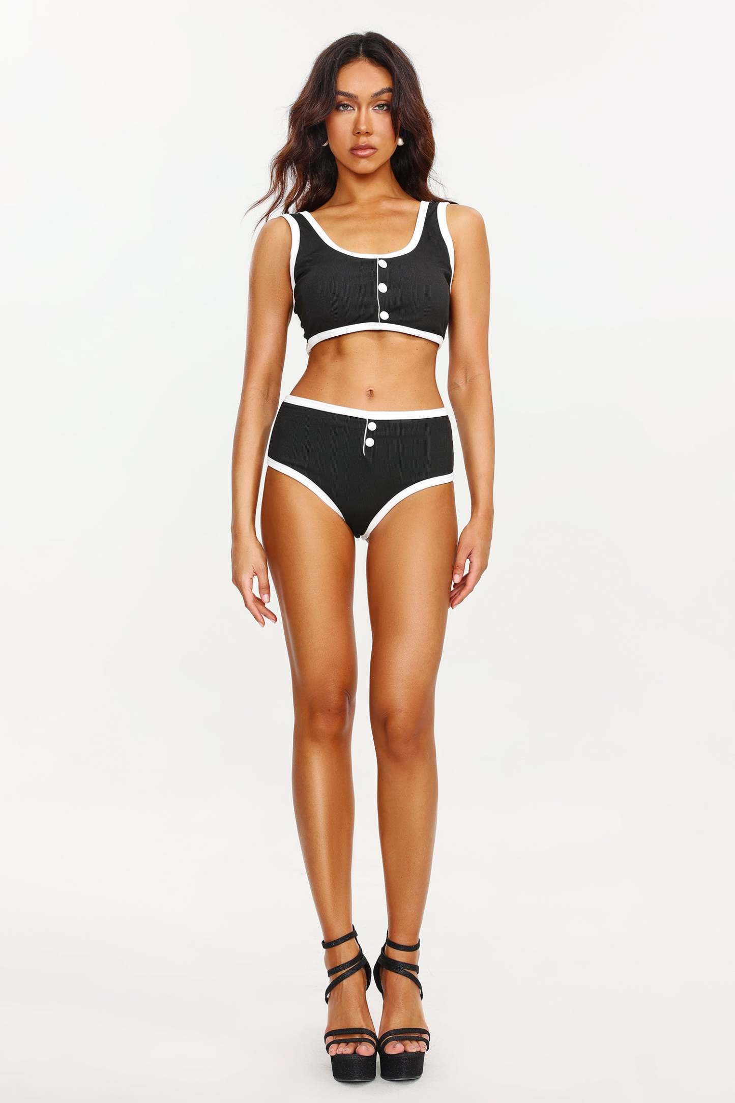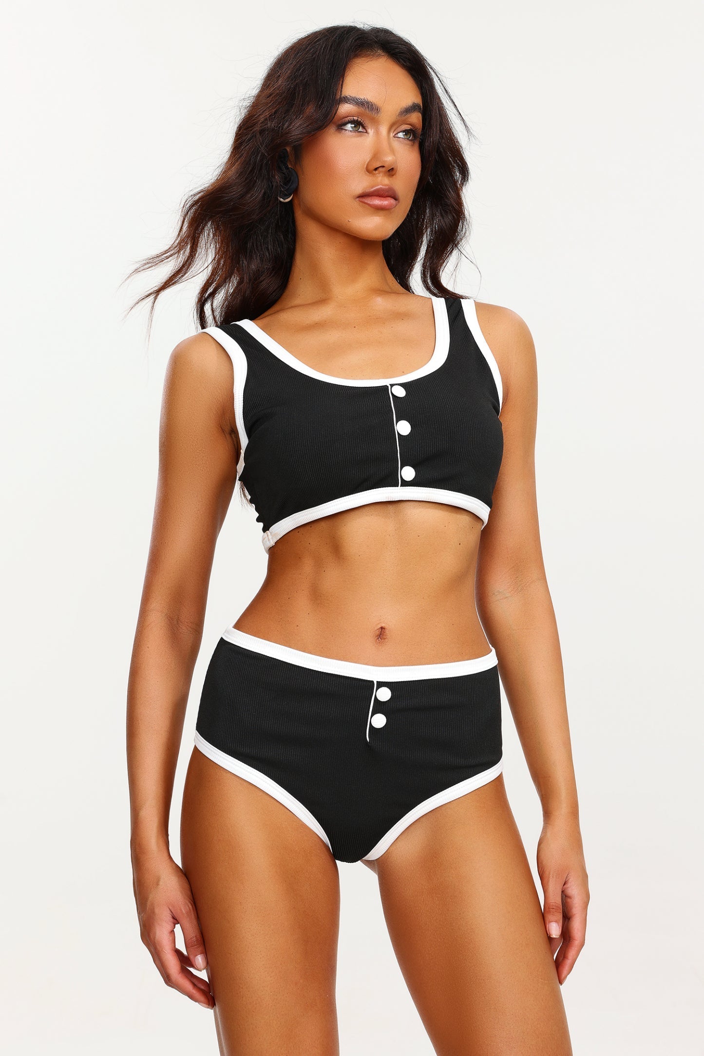 Düğmeli Spandex Siyah Beyaz Mayo Takımı