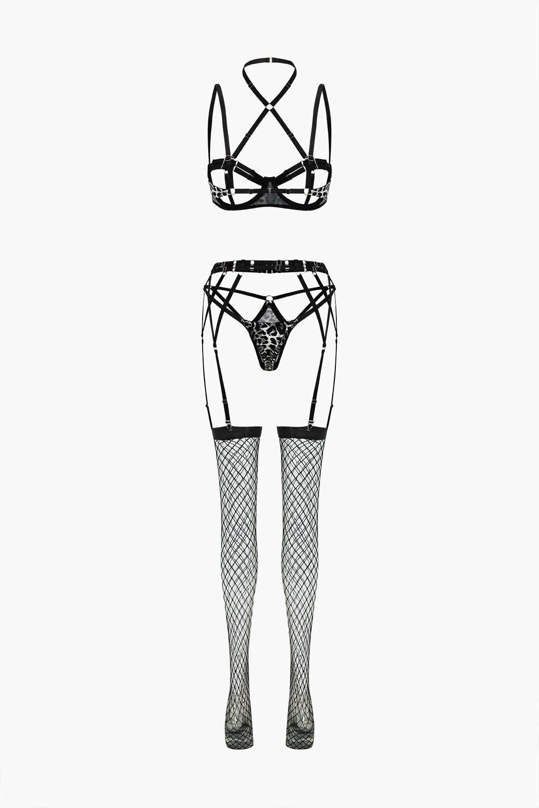 Leopar Desenli Sırt Dekolteli İç Giyim Jartiyer Seti